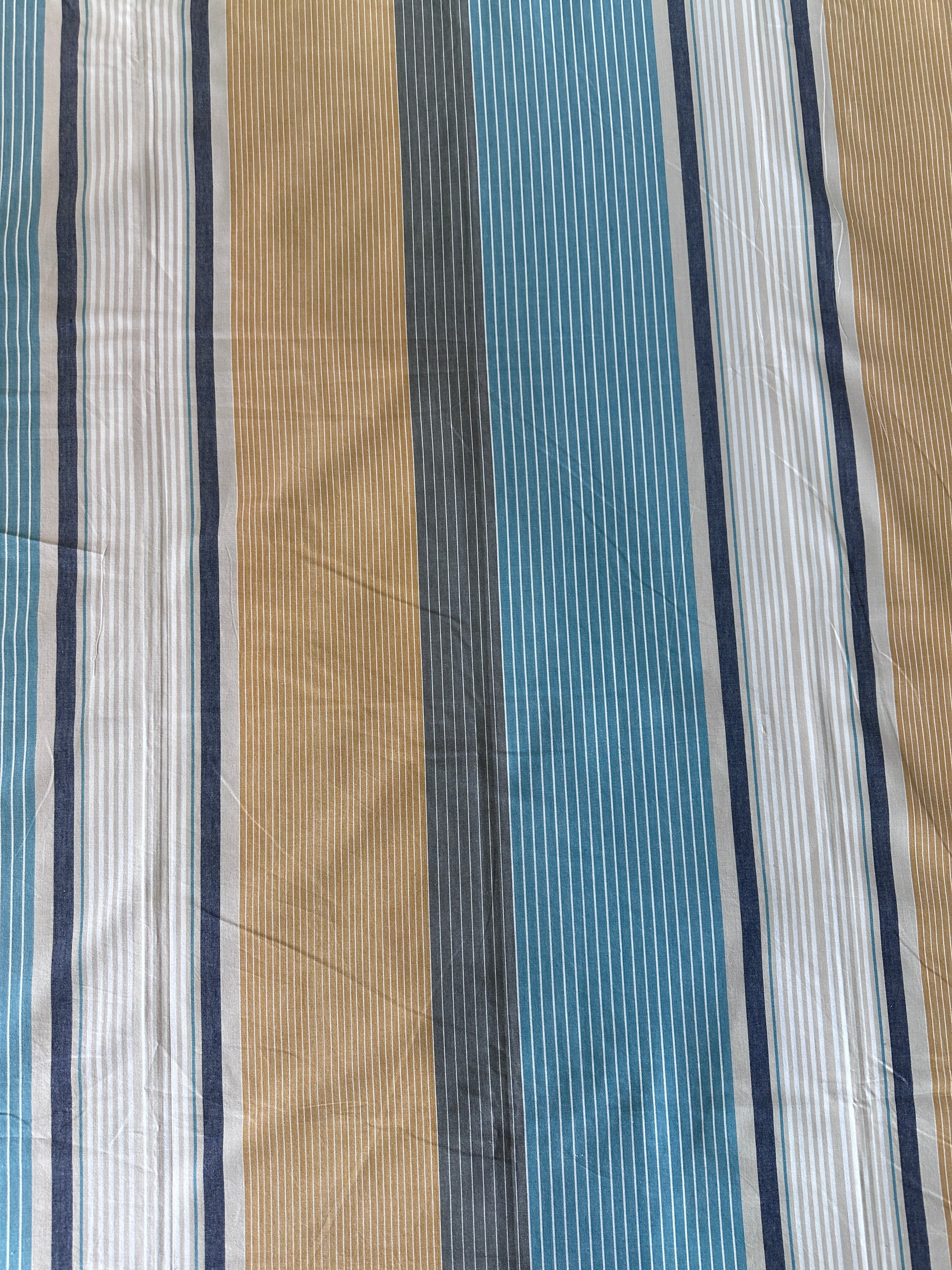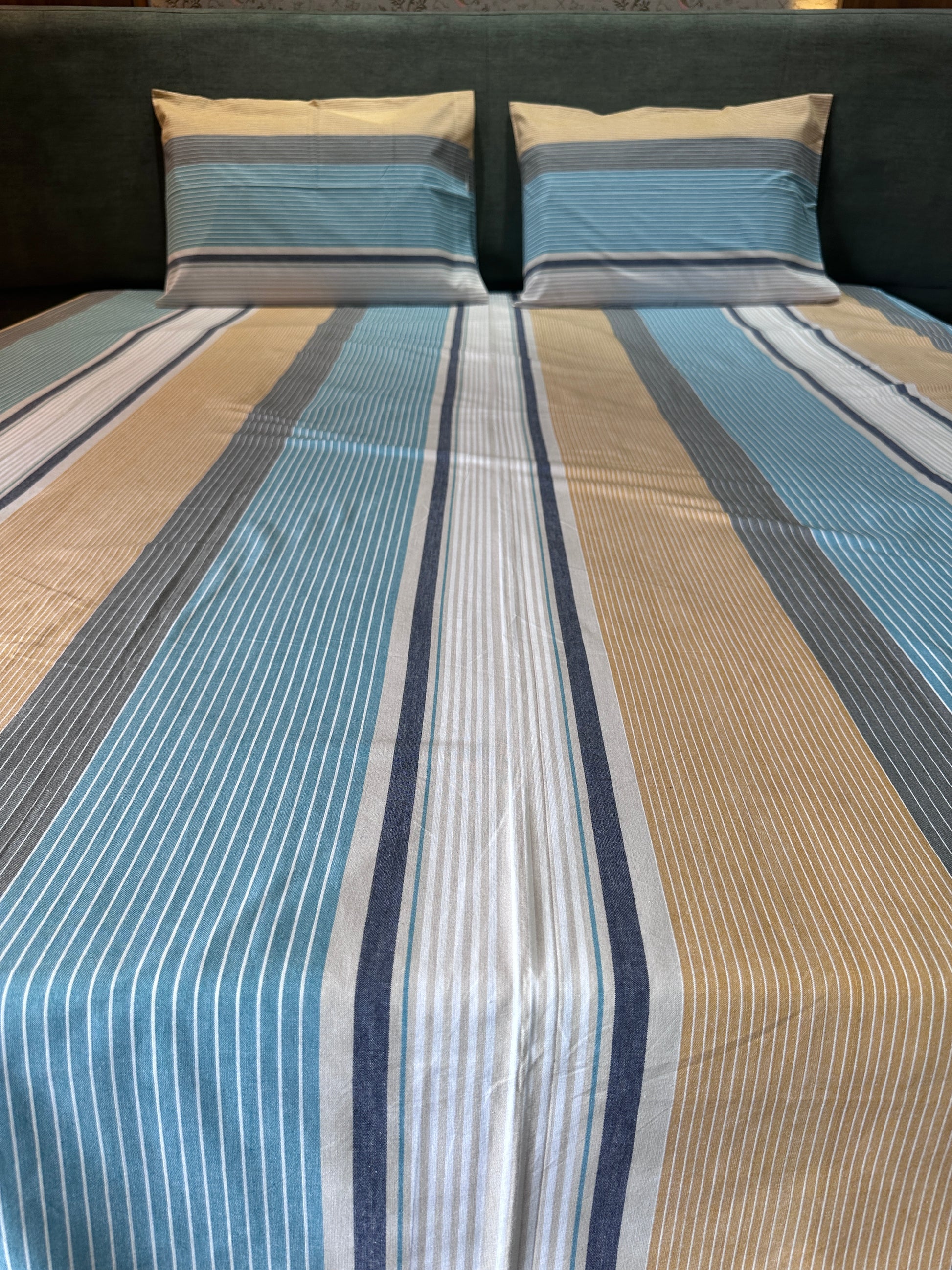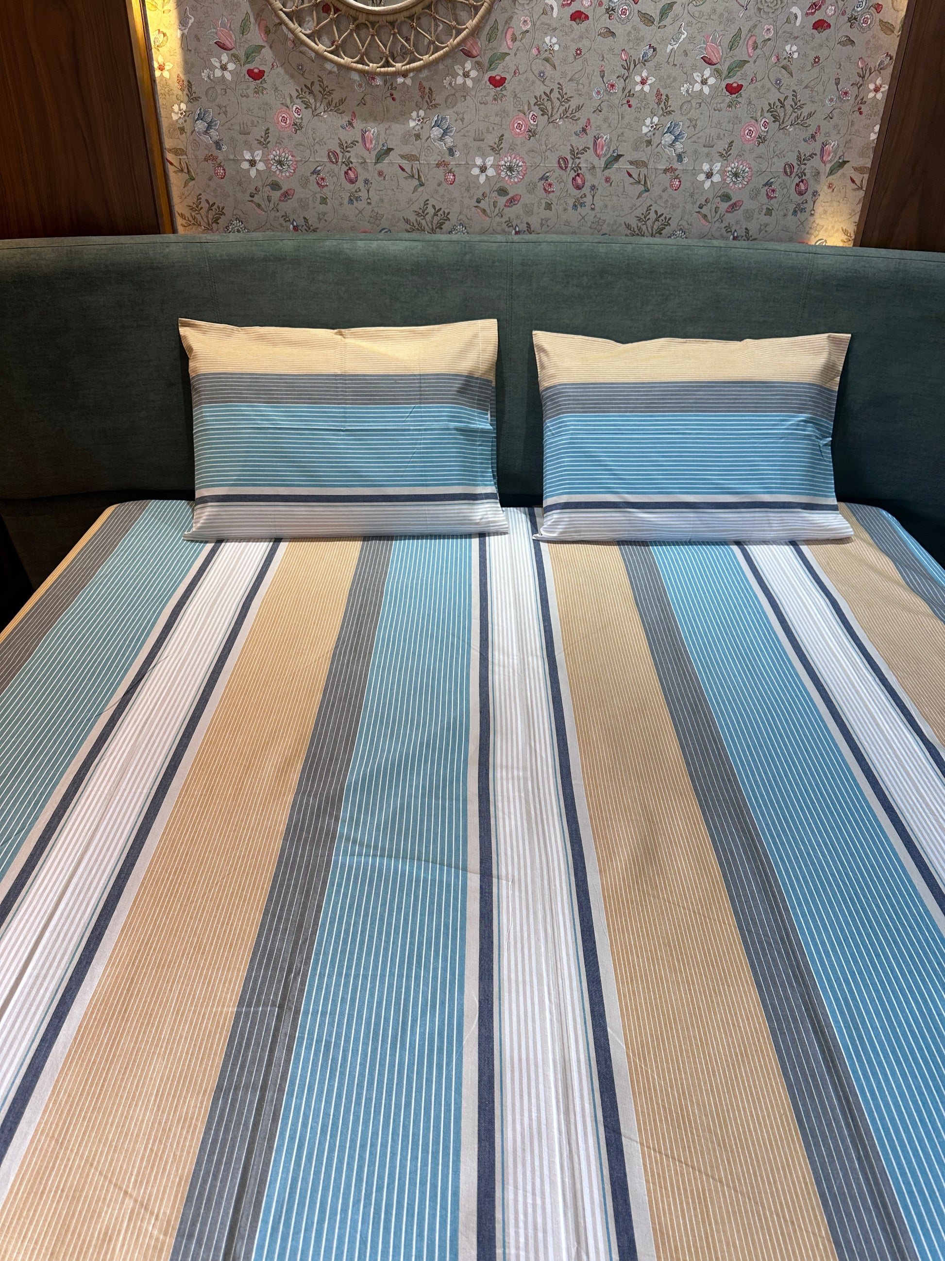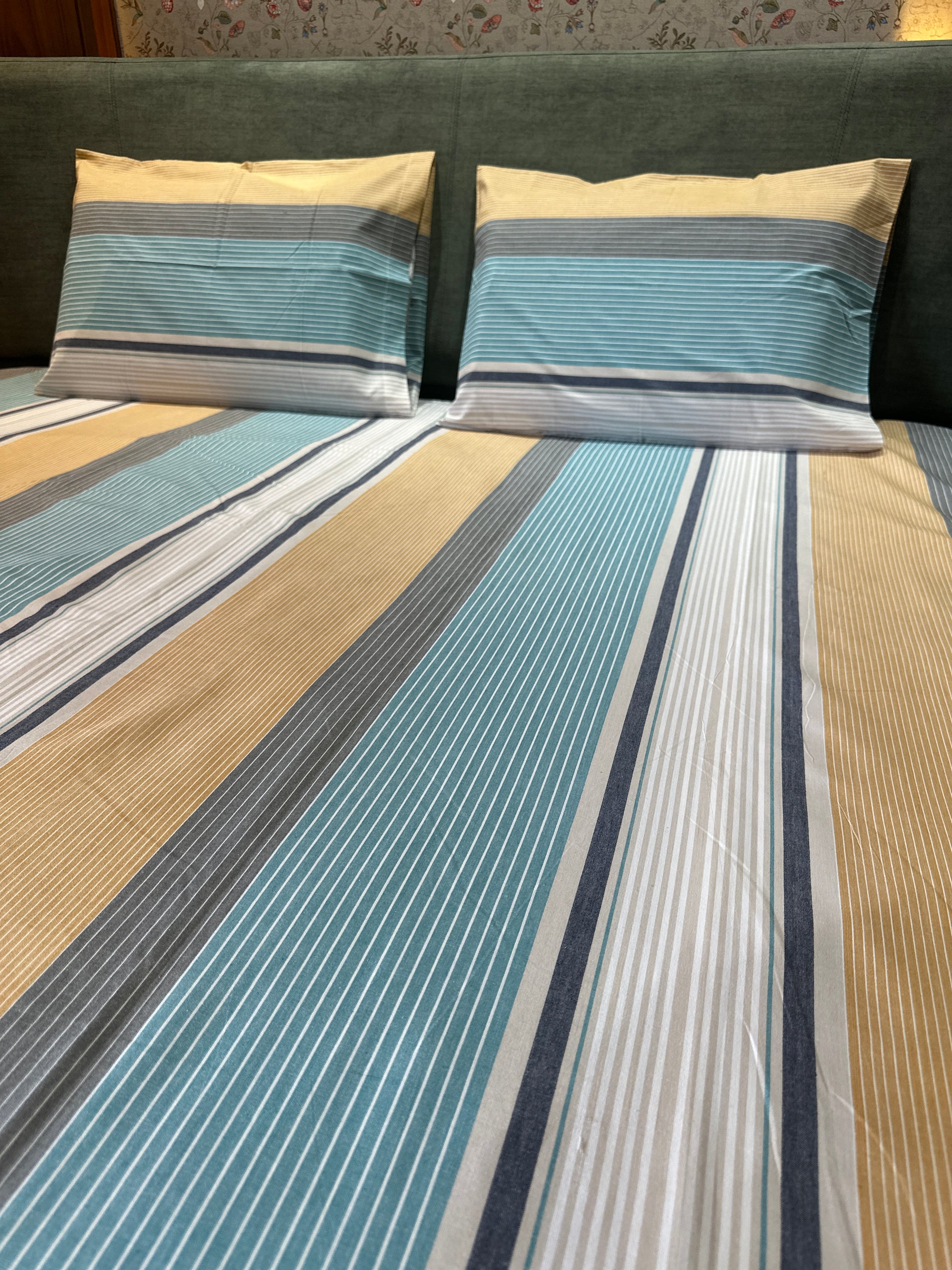 Blue and Mustard Striped Bed Sheet with 2 Pillow Cover
