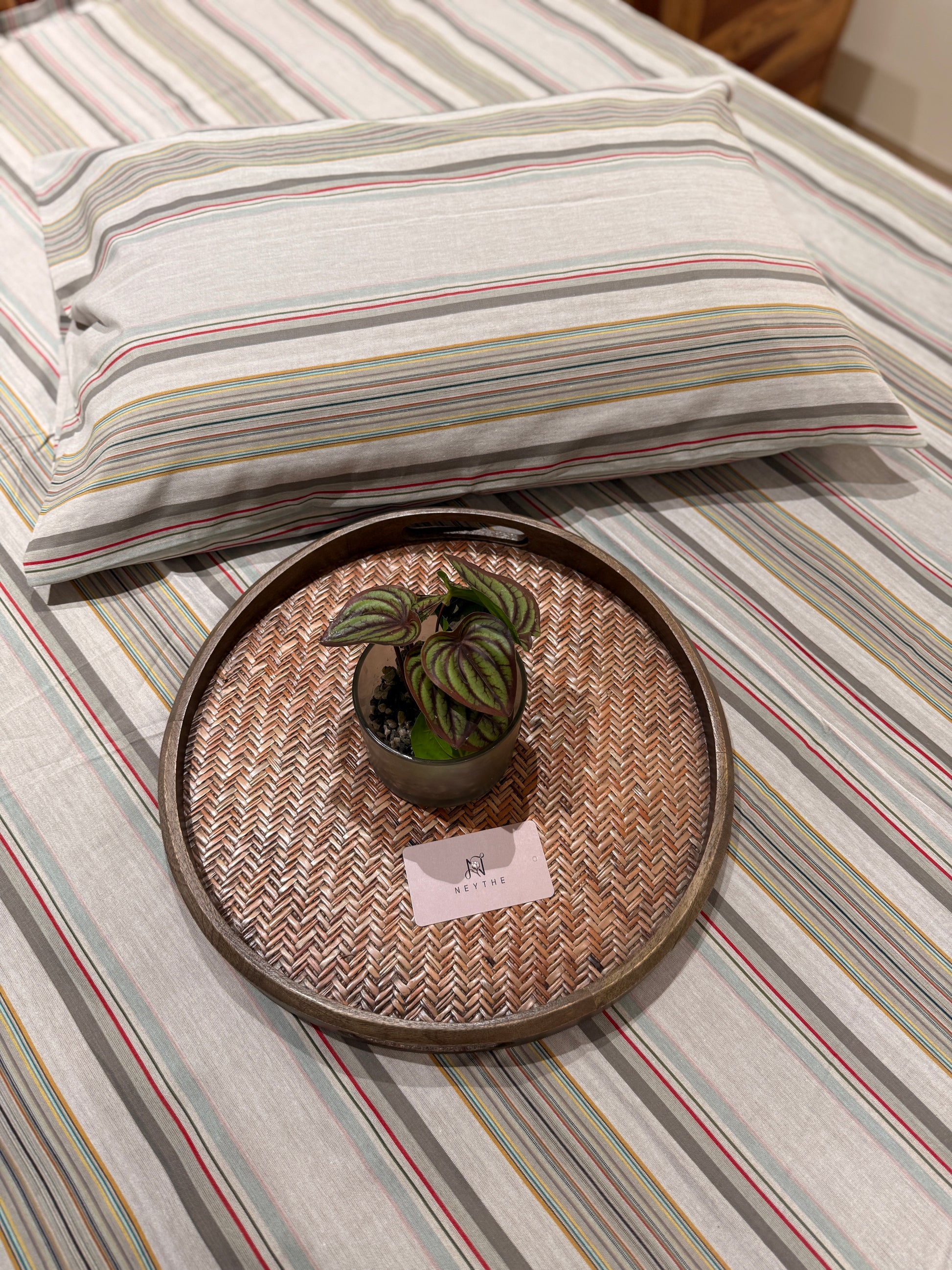 Grey Red Mustard Stripe Bed Sheet with 2 Pillow Cover